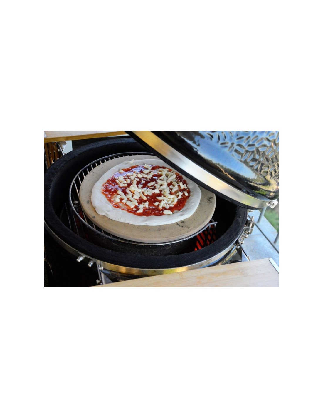 La barbacoa kamado Monolith puede cocinar auténticas Pizzas con el mismo sabor que la cocción en un horno de leña. Se alcanzan fácilmente temperaturas hasta 350 / 400 °C y puedes cocinar la Pizza perfecta en un máximo de 3 minutos, o bajar la temperatura y cocinar el pan.