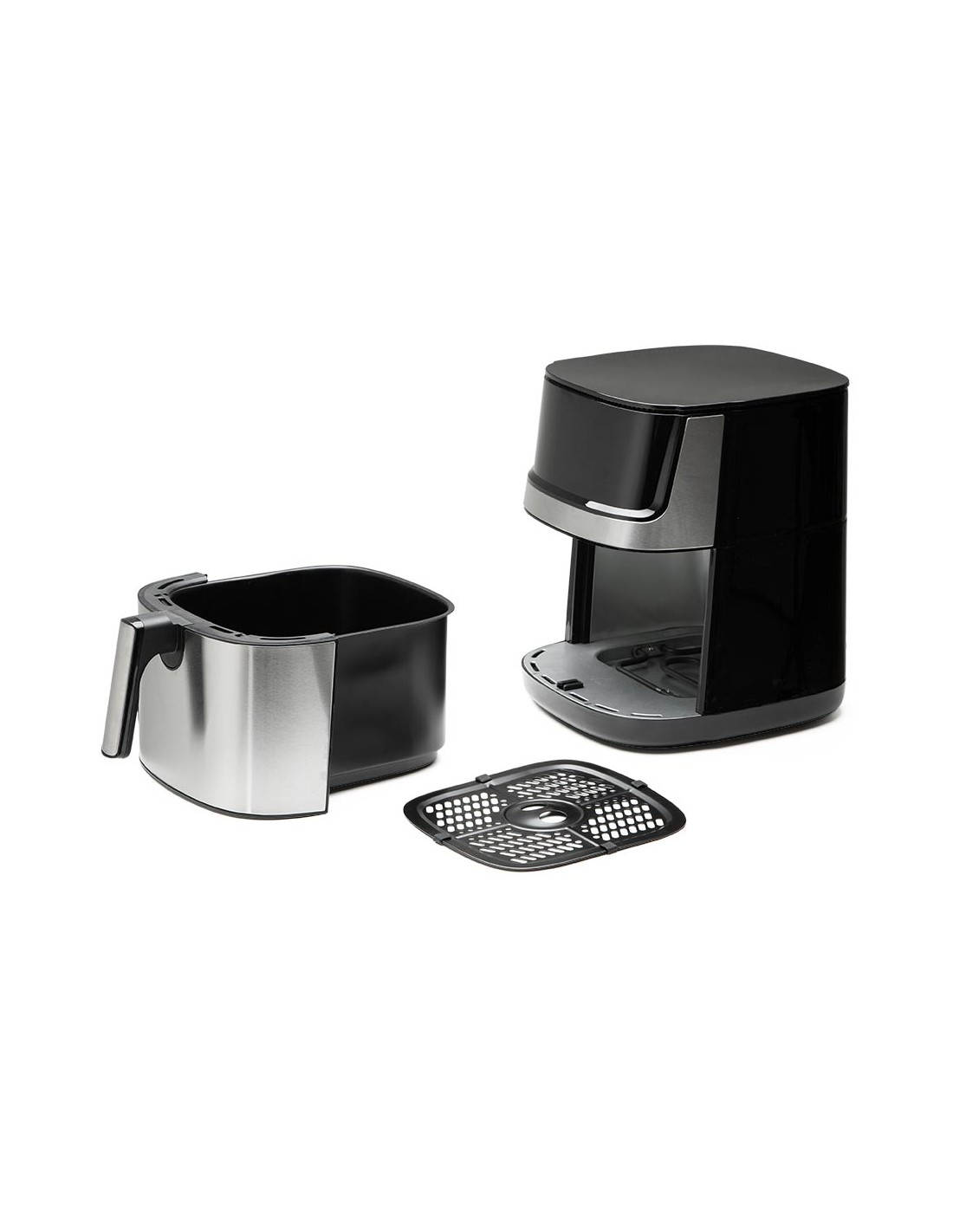 El frontal con detalles de acero inoxidable no solo aporta un toque de elegancia a la cocina, sino que también garantiza durabilidad y resistencia al desgaste. La pantalla LED con control táctil permite un manejo intuitivo y sencillo, haciendo que la operación de la freidora sea tan fácil como tocar un botón. La pantalla muestra claramente el tiempo y la temperatura de cocción, proporcionando un control total sobre el proceso.