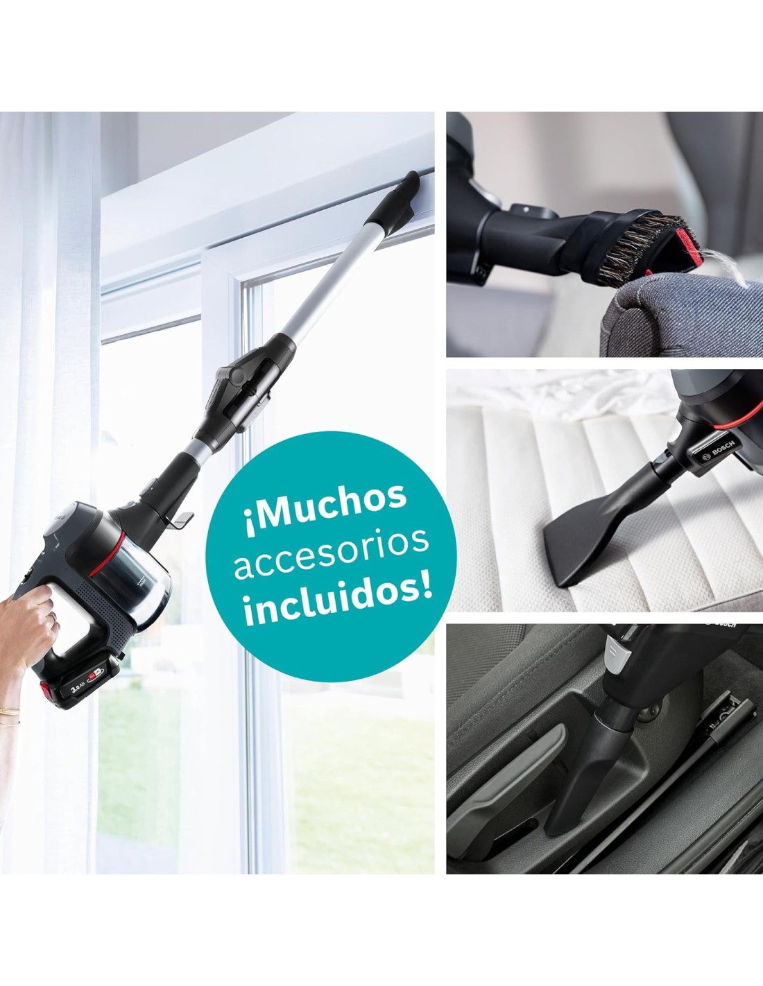 ModeloUnlimitedPropuesta diferencialPara el día a díaColorGranito oscuroDimensiones (AltoxAnchoxFondo)1315x252x204 mmPeso (listo para usar)2.9 kg10 años de garantía en el motor1Nota inicial 1: Condiciones de garantía en https://www.bosch-home.com/motor-warranty/SíNiveles de aspiración3Modo AutoSíAutonomía (max)40 minNum. de baterias intercambiables2Tipo de bateríaLitioTiempo de carga05:00 hCargador rápidoNoTensión18.0 VPotencia de la bateria3.00Nivel de ruido82 dB(A) re 1pWSistema de filtradoSin bolsacontenido, depósito de polvo0.3 lAccesorios incluidos1 x Boquilla para hendiduras, 1 x Boquilla para colchones, 1 x Cable de carga, 2 x Batería intercambiable, 1 x Estación de acoplamiento, 1 x Cepillo 2en1 para muebles y tapiceríasCepillo para alfombra, moquetaEléctrico