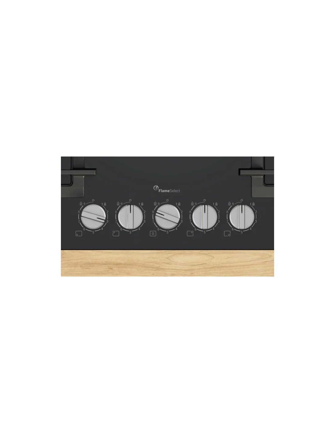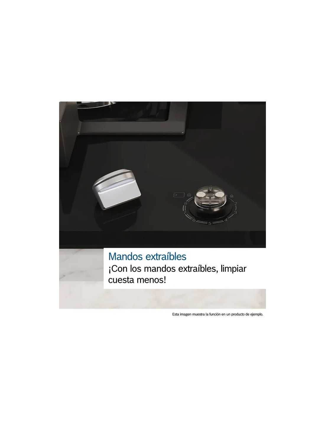 Placa de gas con un preciso control de la llama y fácil limpieza gracias a los mandos metálicos extraíbles y sus parrillas de hierro fundido lavables en el lavavajillas.