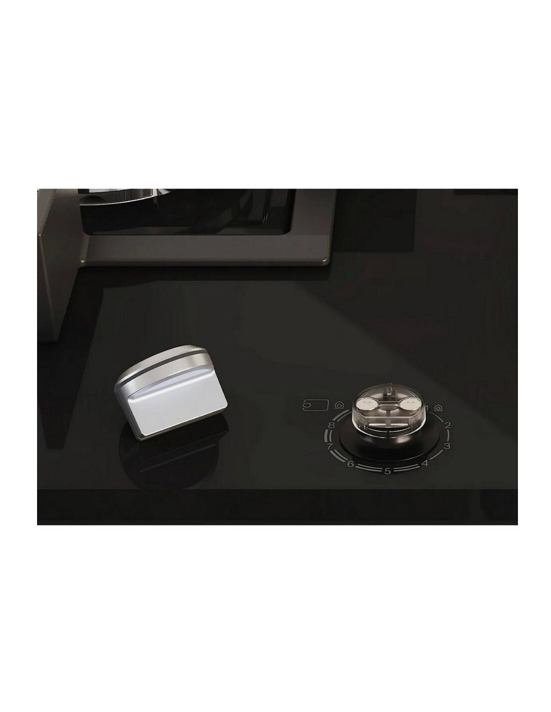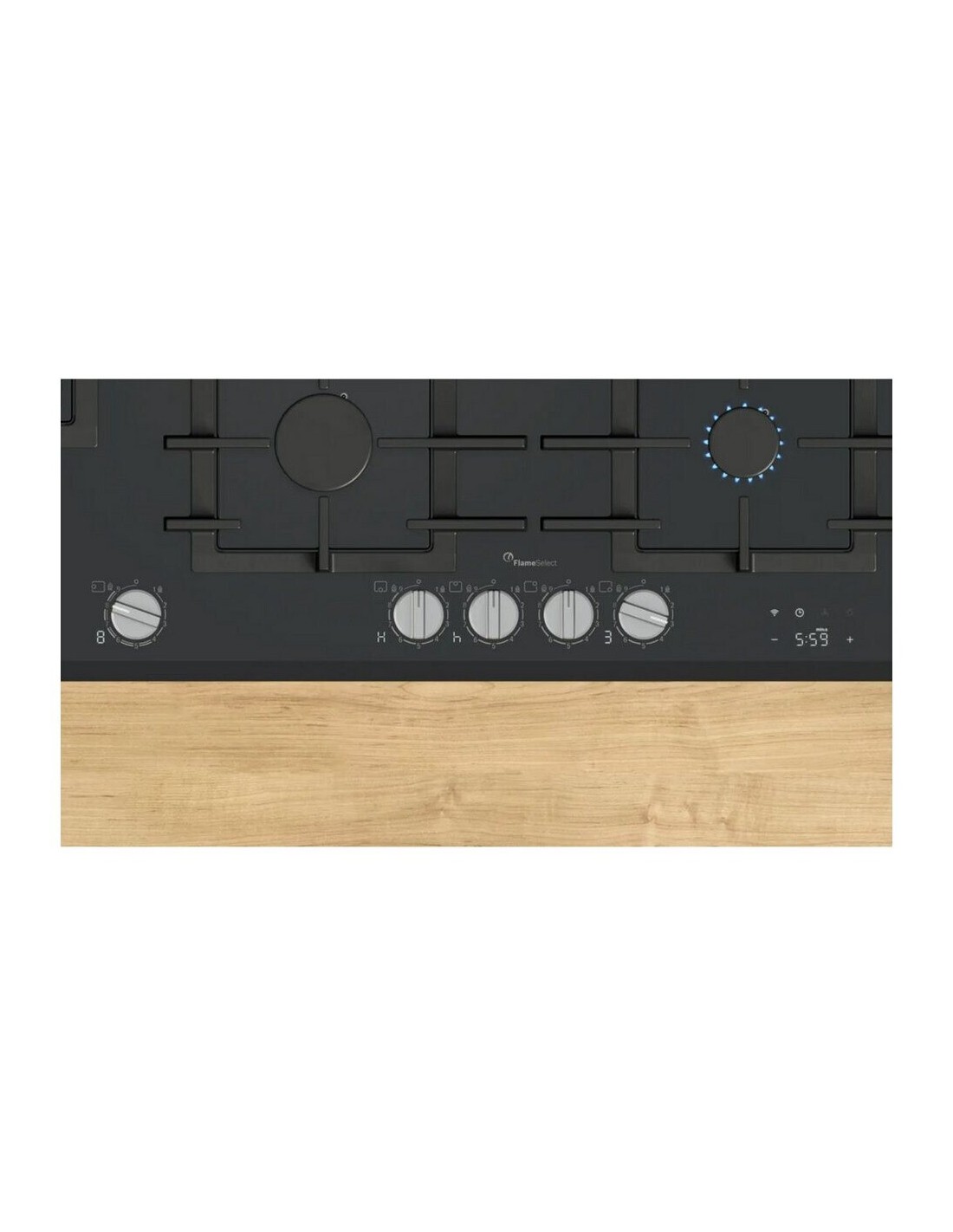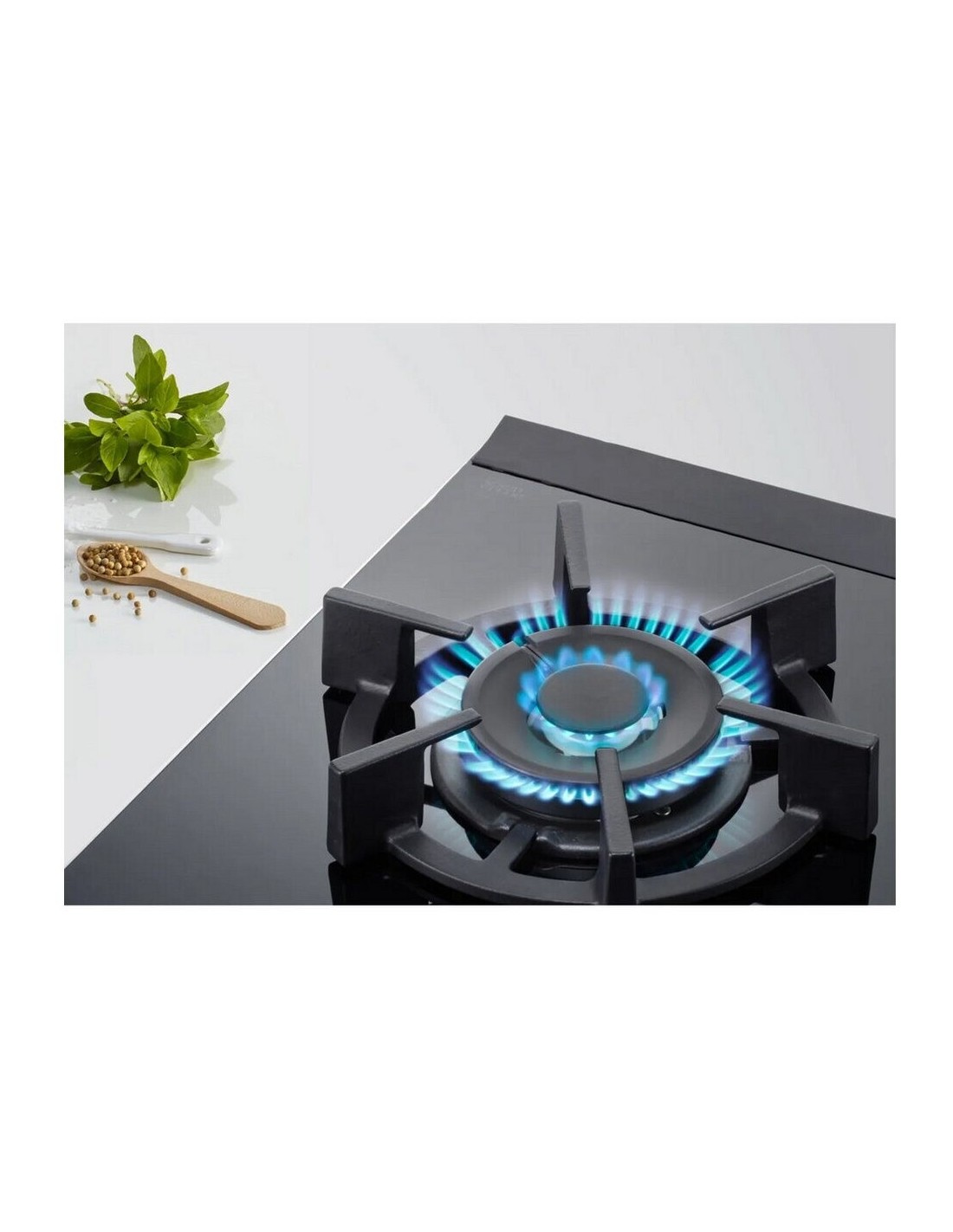 Placa de gas con un control preciso de la llama, control placa-campana y fácil limpieza gracias a sus mandos metálicos extraíbles y parrillas de hierro fundido lavables en el lavavajillas.