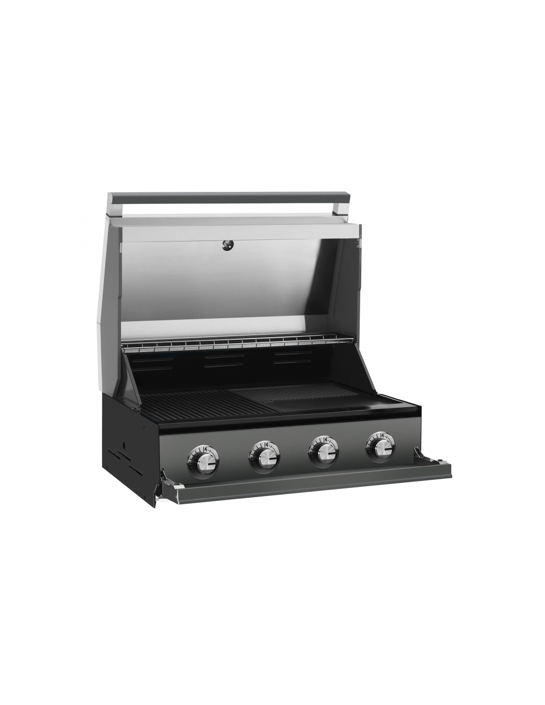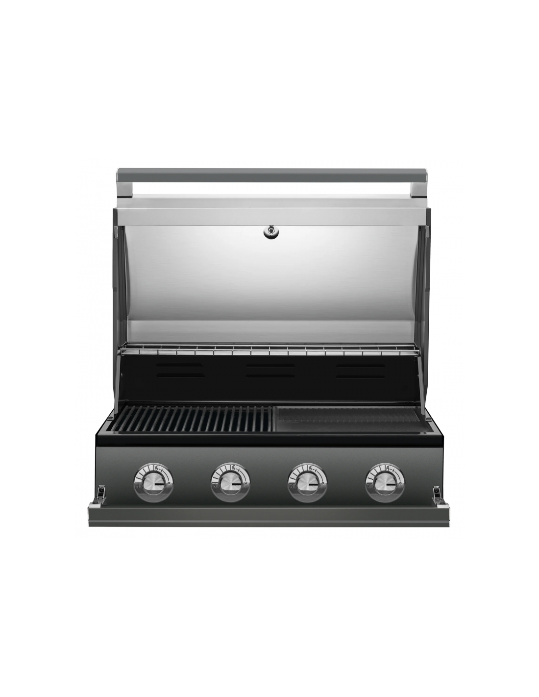 - Cierra el panel que tapa los mandos de control para un aspecto impecable cuando la barbacoa no esté en uso y ábrelo para disfrutar de un pequeño estante cuando estés cocinando.