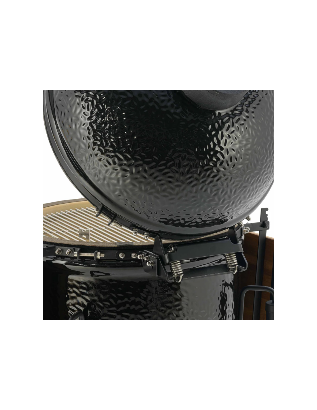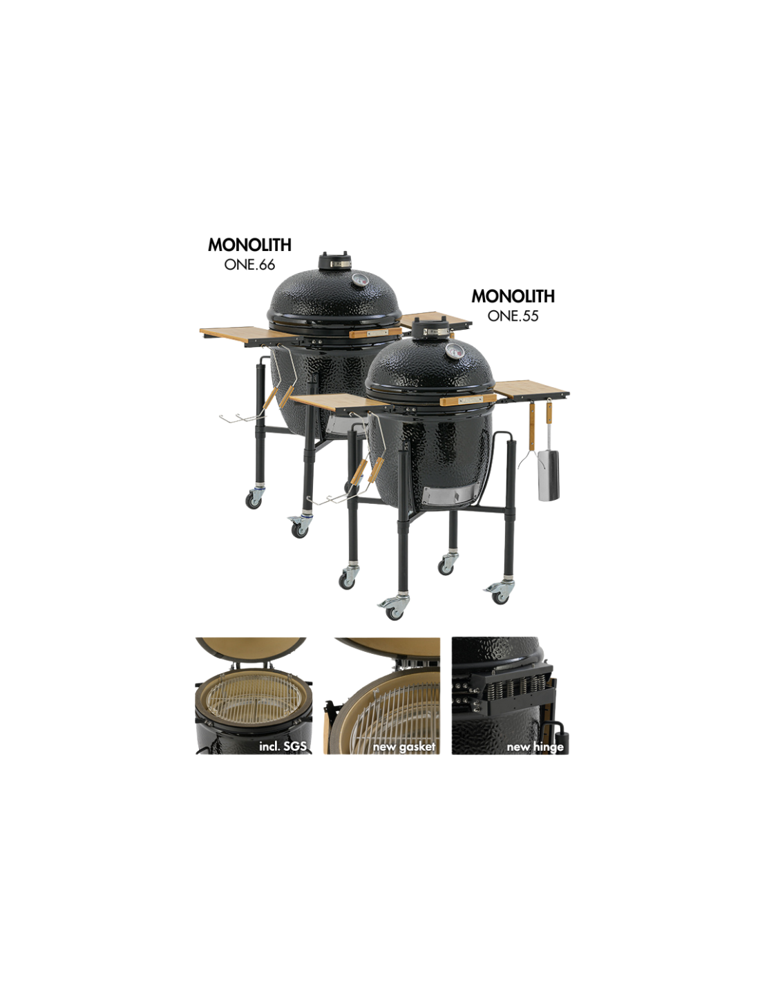 Por ejemplo, falta el sistema de alimentación para la inserción de chips y pellets para ahumar, al igual que las dos bandas de acero inoxidable de la base y la tapa. Sin embargo, tiene unas nuevas juntas de acero y fibra de vidrio en negro. El modelo Monolith ONE.55 no tiene límites y se puede completar, como los demás modelos, con numerosos accesorios como rustidor, parrilla de hierro fundido, piedra para pizza, sistema de wok, etc.